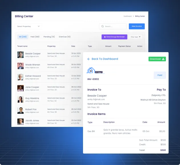 RentPro streamlines billing and invoice management with automated solutions for payments, reminders, and detailed reports.